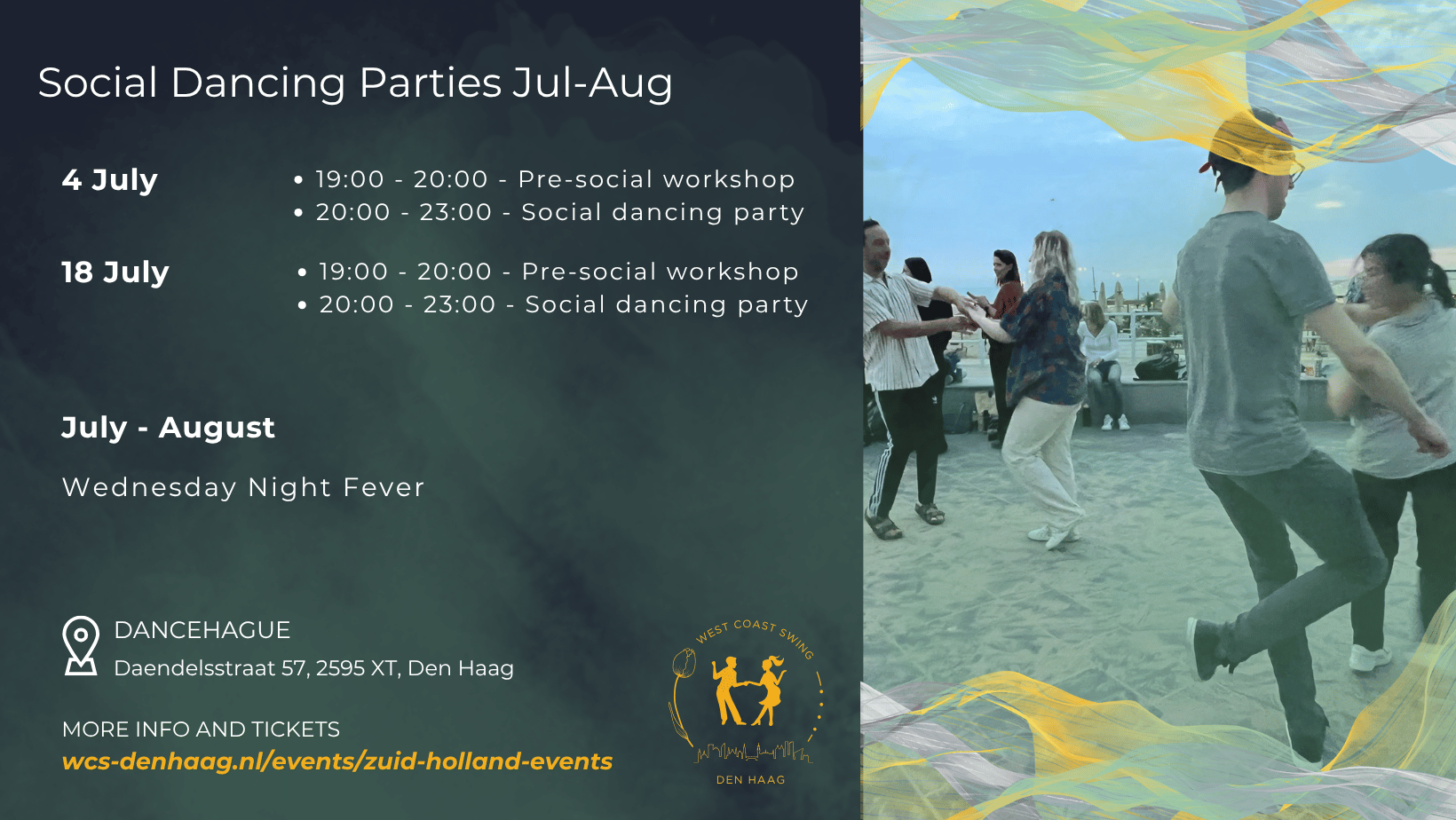 Join us for a cosy West Coast Swing social dancing party in Den Haag. This is where you can put everything that you've learned so far to good use, build up the confidence to ask for dances (leader or follower) and start exploring this dance "in the wild" ;)